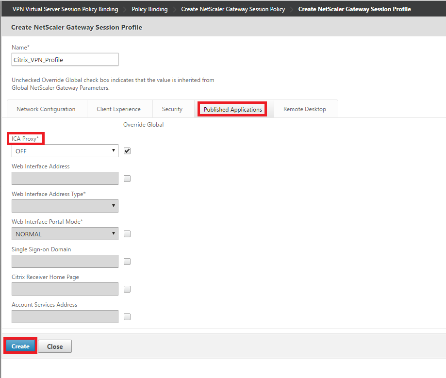 9. In the same page, now click on Published Applications tab and check Override Global check box for “ICA Proxy” and set it to “OFF” from the drop down and click Create.